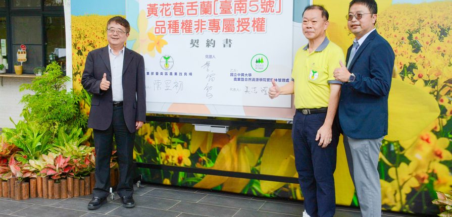 率先登場為「台南5號」授權簽約儀式,由臺南區農業改良場授權予中興大學實驗林管理處,雙方將攜手推動新品種蘭花在景觀營造、校園綠美化及居家栽培等領域的應用與推廣。曾被列為國內瀕危的野生苞舌蘭,在農業改良場的努力下,陸續育成新品種,首見的黃色大花「台南5號」為大型苞舌蘭品種,花色亮眼的黃色大花,花莖可超過75公分,花期長達3個月,具備抗病性強、栽培管理容易等優勢。未來將由興大實驗林管理處新化林場進行推廣與銷售,帶動園藝產業的新風貌。